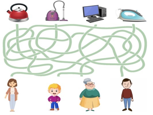 -Ребята, я приготовила для вас интересную игру «Кто чем пользуется?». -В этой игре мы будем учиться понимать, какие электроприборы нужны разным людям для их работы или домашних дел. -У каждого из вас будет карточка с лабиринтами. Посмотрите внимательно: здесь нарисованы герои и электроприборы.