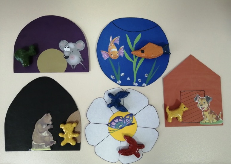 Воспитатель раскладывает перед детьми козули сопровождаяпотешкой и предлагает найти для них свой домик: рыбки в аквариум, бабочки на цветок, мышка в норку, мишка в берлогу, собачка в конуру.