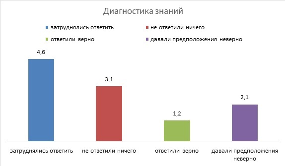 Анализ результатов диагностики детей показал, что 1,2% детей смогли самостоятельно ответить на поставленные вопросы, рассказали кто такой тигр, где обитает, чем питается. 2,1% детей отвечали, но не верно. 3,1% детей не ответили ничего. 4,6% детей затруднённо ответили на поставленные вопросы, только с помощью воспитателя.