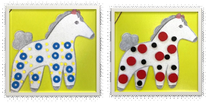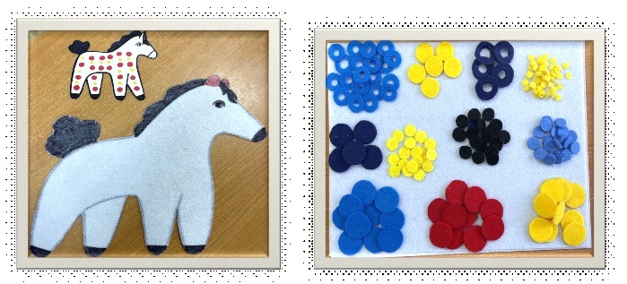 Данное пособие представляет собой силуэт лошадки и белого фетра. Детали для украшения лошадки дымковским узором (из цветного фетра кружочки, колечки разной величины, точки). Карточки-образцы вариантов украшения лошадки. |