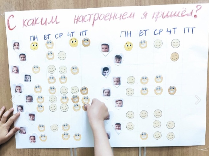 Утро. В рамках утренней беседы. Ознакомление детей с темой «Эмоции мои друзья», которую будет освещать воспитатель на протяжении 2 недель. Ознакомление с картой настроения, которую ежедневно утром и вечером будут заполнять воспитанники. Карта настроения - список воспитанников на листе формата А5, напротив каждого есть строчка в которой мы пиктограммой отмечаем настроение с которым ребенок пришел в сад и с которым покинул сад вечером. Обозначаем настроение подготовленными смайлами – радость, грусть, спокойствие.
