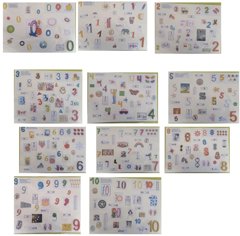 Числовой фриз - это последовательность из 11 страниц, расположенных в порядке возрастания представленных на них чисел. Каждая страница - это тематический коллаж, на котором представлен образ цифры, соотношение количества предметов с числами первого десятка. Каждая страница — это тематический коллаж, собранный в аппликативной технике из картинок, представляющих собой качественную характеристику числа.