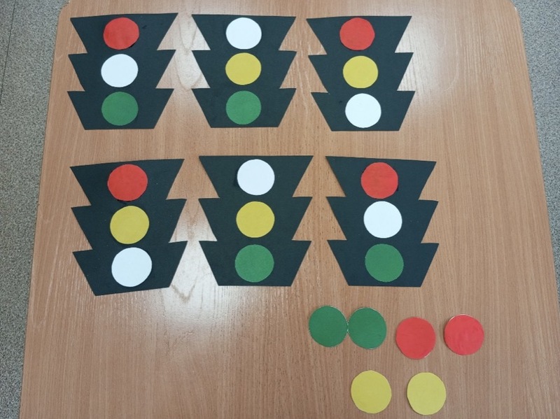 Перед ребятами лежат светофоры и фишки. Два цвета у светофора есть, а вместо третьего – белый кружок. Задача ребенка – подобрать нужную фишку и положить ее на светофор там, где она должна быть. Выигрывает тот, кто справился с задание быстрее.