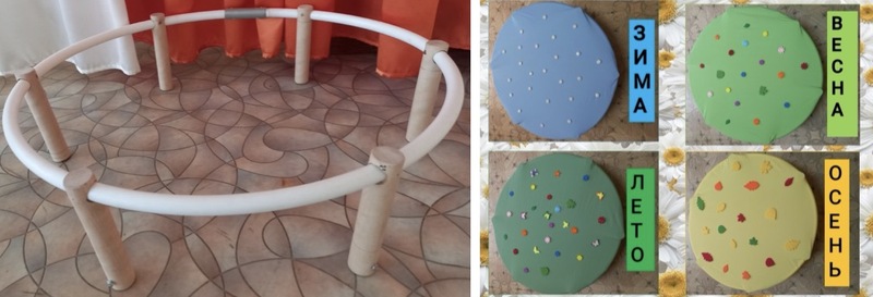 Многофункциональный стол представляет собой каркас из пластиковой трубы (диаметр – 70 см.), с прикреплёнными к ней деревянными ножками (высота – 20 см.). На основу одевается соответствующее полотно: зима, весна, лето, осень (в планах – космос).
