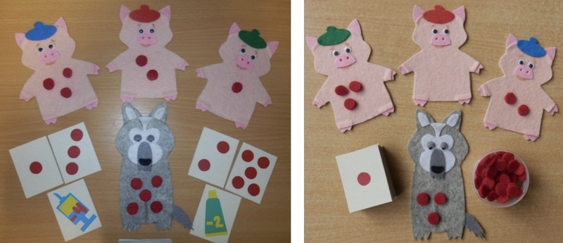 - три поросенка, сшитые из фетра и один волк. Все ветрянки (маленькие, красные кружочки, вырезанные из картона) лежат в контейнере.