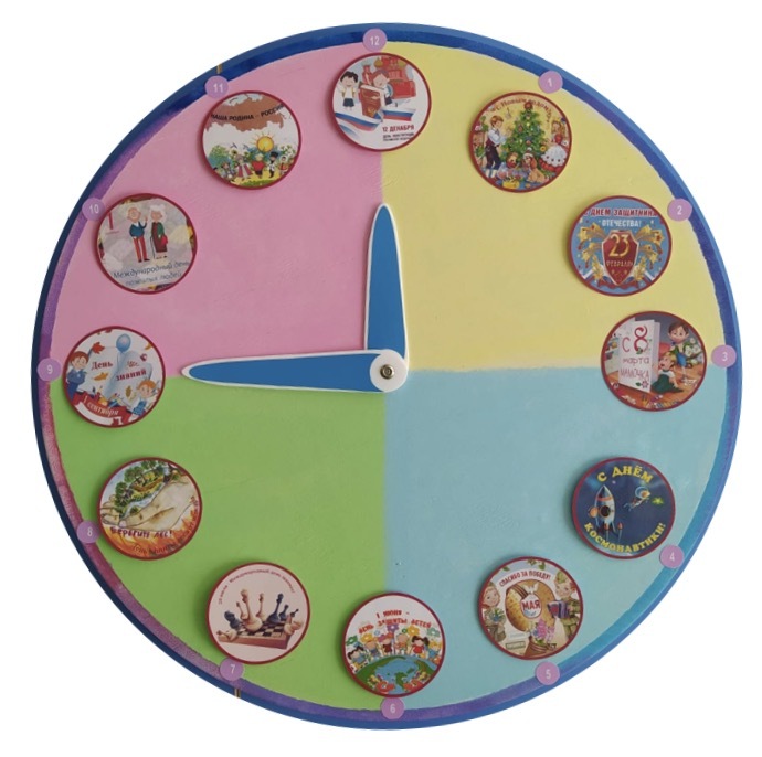 Сменность наглядного материала очень удобна для «насмотренности» детей и для более глубокого изучения какой-либо темы согласно недельно-тематического планирования образовательного процесса в ДОУ. Например, в преддверии празднования Великой Победы на циферблате, который одновременно постоянно показывает время, могут появиться картинки с фотографиями героев ВО войны (женщин, мужчин, детей и даже животных, которые помогали нашему народу сражаться против фашистов), воинов - наших земляков.