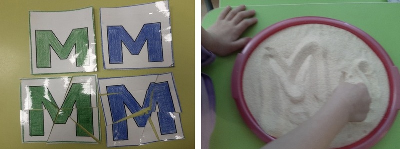 Дети получают конверт с разрезными частями буквы «М» и собирают её, как пазл.
