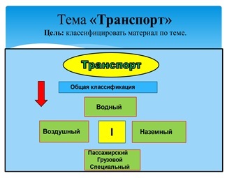 Например: тема «Транспорт», цель: помочь классифицировать материал по