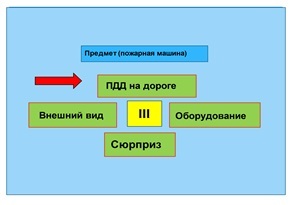 Переходим к третьему боксу. Подробно знакомим детей с пожарной машиной (внешний вид, ПДД на дороге, оборудование).