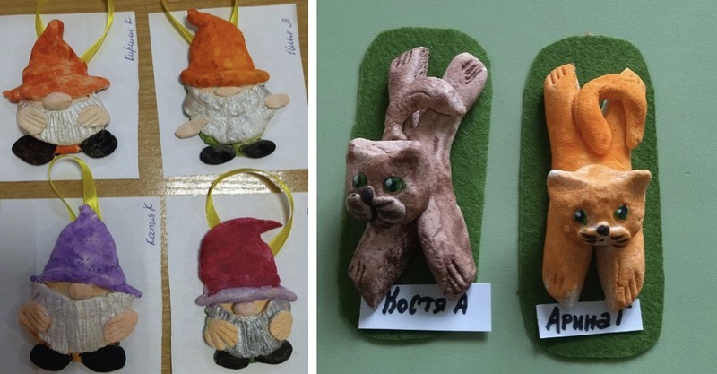 Если ребенок лепит дома с родителем, то изделие можно высушить в духовом шкафу. А если дети лепят в образовательном учреждении, то изделия высушиваются на воздухе, либо на батарее если это отопительный сезон. При изготовлении изделий главное в процессе научить детей самостоятельности и аккуратности. Начать лучше с простых приемов лепки (разминание, отщипывание, скатывание в шарик, раскатывание жгута, сплющивание) и постепенно усложнять задания. Так же в работе с тестом можно использовать различные формочки которые идут для работы с воздушным пластилином или формочки для печенья. Чтобы работы были более объемными можно основание сделать из скорлупы грецкого ореха, цельных орехов, желудей, фольги. Так изделия быстрее просыхают. В украшении изделий так же можно использовать различные бусины, бисер, пайетки, крупы и т.д, что расширяет творческие возможности и развивает фантазию.
