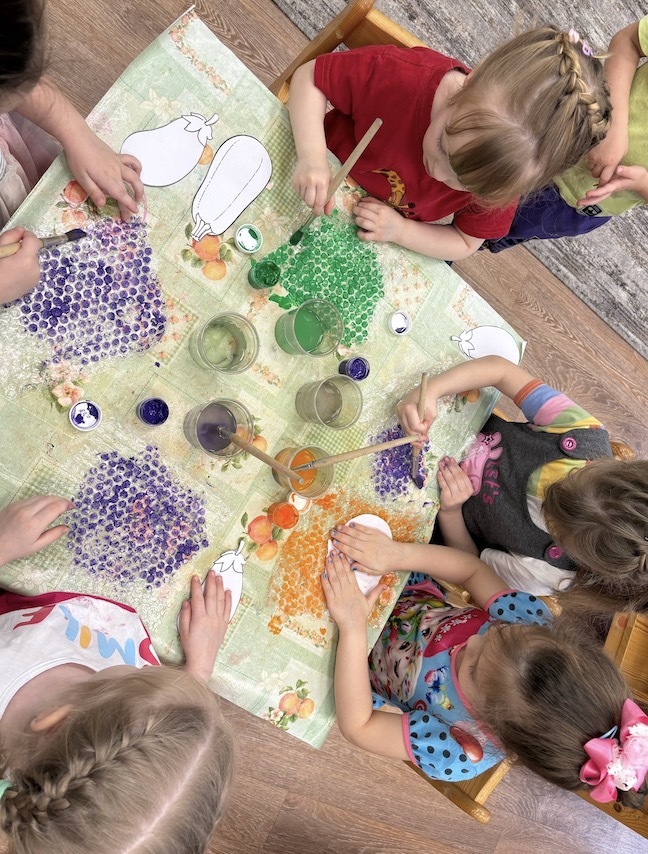 «Рисуем на пупырках». Они красили пупырку гуашью и делали отпечатки на бумаге. Получались удивительные узоры – «панцирь черепахи», «рыбки». Это развивает не только моторику, но и воображение.
