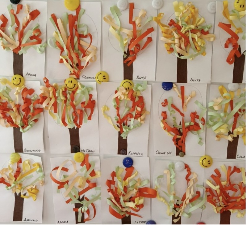 Воспитатель. Ребята, посмотрите какой замечательный яркий лес у нас получился. Каждое дерево уникально. Как вы аккуратно приклеили стволы, а кудрявые ветки наклеены у всех по-разному.