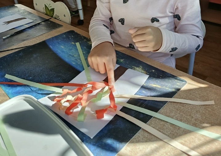 По ходу работы воспитатель дополнительно показывает, как закручивать полоски для «кудрявости» веток.