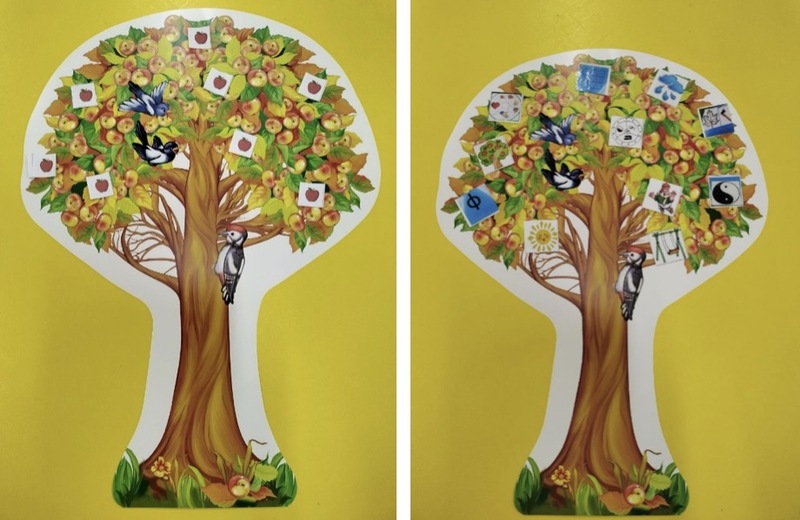 Пособие представлено яркой яблонькой, на которой расположены картинки с изображением снежинок. С обратной стороны изображены символы с обозначением игры в соответствии с основными блоками комплекса «Я познаю мир», плюс дополнительно «сюрпризный»:
