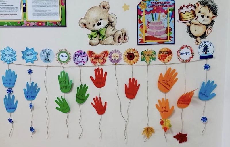 На большом стенде размещены все месяцы года, а под каждым месяцем красуются очаровательные ладошки детей, сделанные из цветной бумаги. На каждой ладошке аккуратно написана цифра - возраст ребёнка, и его имя.