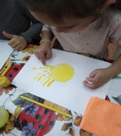 вот мой пальчик, я опускаю пальчик в гуашь. Мой пальчик стал желтым. А сейчас я прикоснусь пальчиком к листу бумаги возле желтого круга, и еще несколько раз, что у меня получилось? Лучик солнца золотого. И так я нарисую много лучиков для нашего яркого солнышка. Вот какое солнышко у меня получилось, посмотрите! Но работа моя еще не закончена, теперь мне нужно очистить пальчик он красочки. Я беру бумажную салфетку и аккуратно вытираю пальчик, стараюсь не оставить красочку на нем. Потом я промываю пальчик в стаканчике с водой, и чистый пальчик вытираю другой салфеткой. Все мои рисунок готов и ручки остались чистыми.