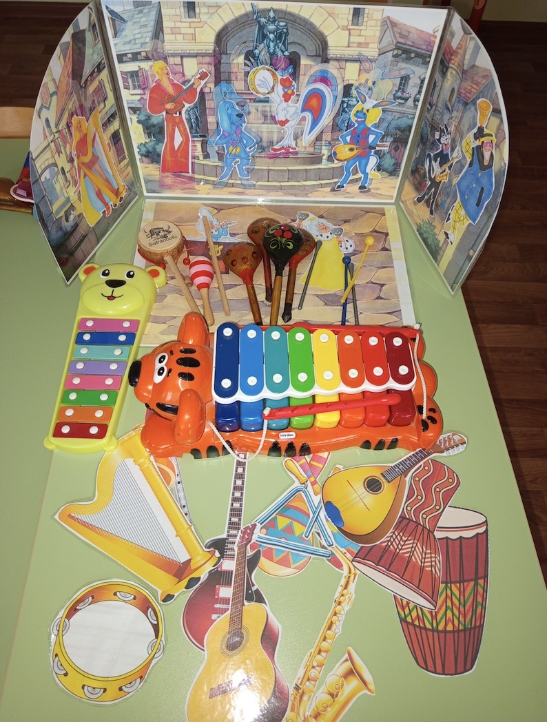 Звучит фонограмма звучания музыкальных инструментов (электрическая гитара, гитара, домра, саксофон, флейта, арфа, треугольник, маракасы, африканские ручные барабаны джембе и тамтам, тамбурин, диатонический колокольчик (РЕ)).