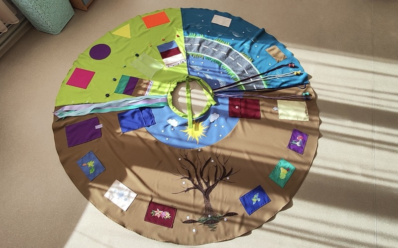 Сенсорную юбку легко превратить в "календарь природы". Меняем с дошколятами декор: зимой крепим снежинки и сугробы, весной — цветы и зеленые листья и т.д. Дети сразу видят и запоминают признаки каждого сезона.