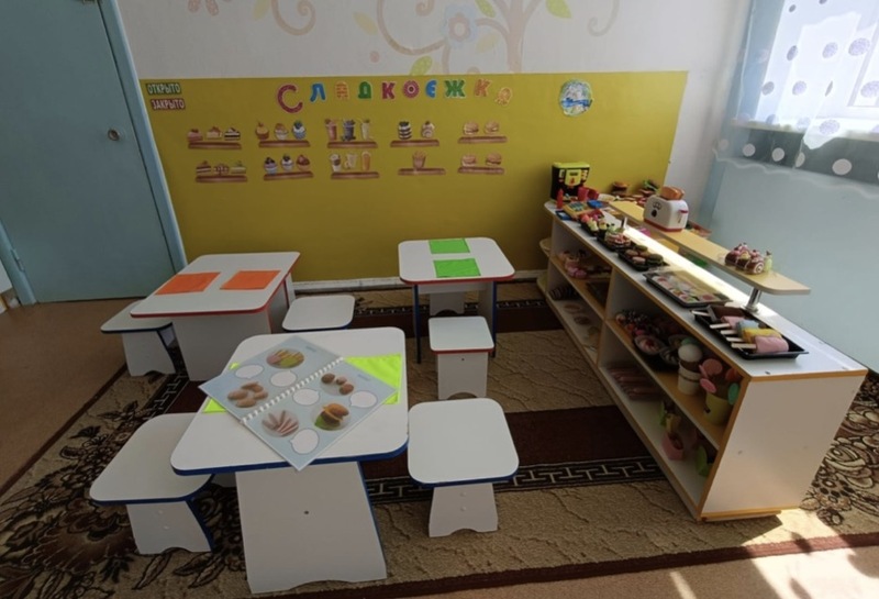 Мы задумались, как можно использовать магнитную стену в сюжетно-ролевой игре. В рамках профориентации, знакомя детей с профессиями повара, кондитера, официанта нами сделаны атрибуты для сюжетно-ролевой игры «Детское кафе». Возле стены мы поставили столики, витрину, разместили на полках «сладости», изготовленные из фетра и воздушного пластилина. На магнитном поле написали меню, прикрепили плакаты с правилами поведения и расписанием работы кафе (Рисунок 2). Игра увлекла детей на несколько дней. Магнитная доска помогла визуально оформить атмосферу игры, не требуя больших материальных затрат на покупку дорогих атрибутов. Ведь сегодня это может быть детское кафе, а завтра – кабинет врача, парикмахерская или ателье.