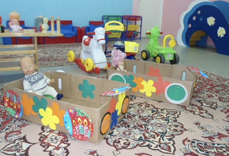 А на этом фото показан мастер-класс по изготовлению легковой машинки из картонной коробки.