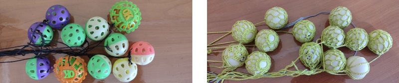 Позже появилась вторая идея. Решила взять обыкновенные теннисные мячики и обвязать их яркими нитками крючком. Получилась дорожка из ярких шариков-маятников.