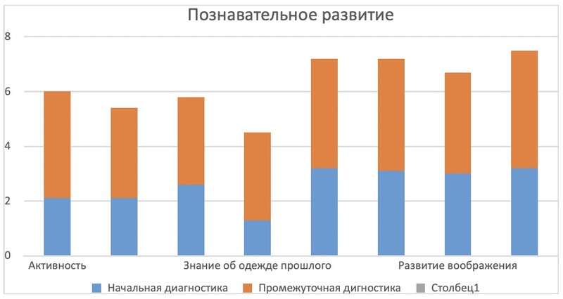 Педагогическая диагностика познавательного развития проводилась в несколько этапов. Сравнительный анализ (май 2025 г. — март 2026 г.) показал устойчивую положительную динамику по следующим показателям: