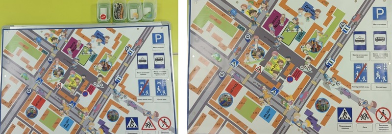 Магнитная доска (50 см по вертикали, 80 см по горизонтали). Плакат с примерной картой расположения дорог и названиями улиц города, с расположениями домов и учреждений, с обозначениями пешеходных переходов и автобусными, и трамвайными остановками, детские площадки. Фигуры на магнитах с изображениями детей и взрослых, автомобили, автобусы, специальной техники (полиция, ДПС, пожарная, скорая…и т.д.), дорожные знаки.
