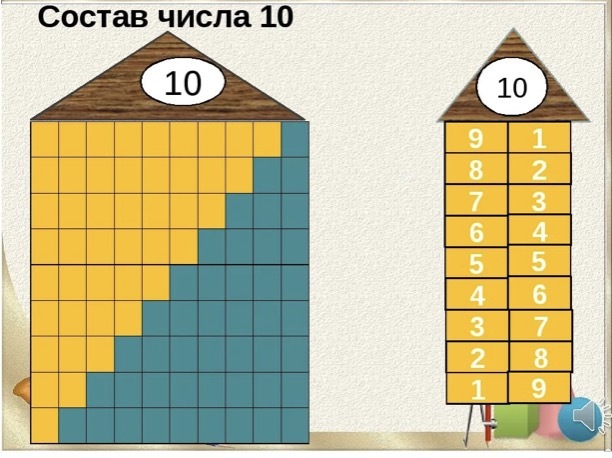 Воспитатель: Посмотрите пожалуйста какая цифра тут живет (10) . Правильно. Сколько этажей в доме? (10). Давайте подумаем, как нам правильно расселить соседей цифр, чтобы вместе по сумме они получились цифрой десять. Итак - какая соседка должна быть у цифры 1. Выкладываем их. Следующий этаж….