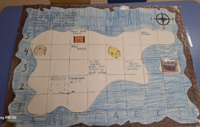 Дети сами придумывают правила. Дети находят Филина-пирата. Двигаются по указанным координатам. Находят конверты с заданиями. Дети выполняют задания, способ выполнения находят самостоятельно.