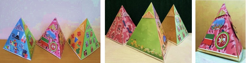 Наглядно-дидактическое пособие «Волшебная пирамида» выполнено в виде трех пирамид, которые можно собрать в одну, вдев друг на друга. Каждая сторона пирамиды представляет собой дидактическую игру. Размер и материал пособия соответствует требованиям, предъявляемым к наглядному пособию. Для игровой активности детей пирамида дополнена вспомогательным материалом – фигурками на липучках.