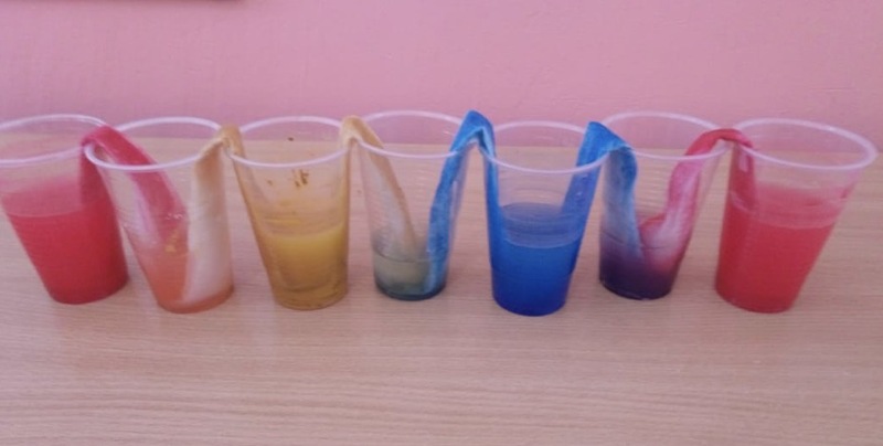 Стали наблюдать…Вода, воспользовавшись узенькими промежутками между волокнами бумаги, начала подниматься вверх, благодаря поверхностному натяжению воды, а затем, под действием силы тяжести, стекать в пустой стакан. Полоска бумаги играет роль капиллярного насоса.