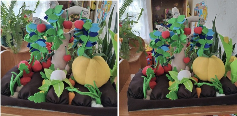 - Карточки с заданиями (по желанию): Например, "Найди все красные овощи", "Покажи, где растет морковка".