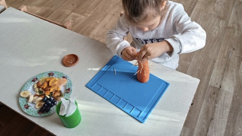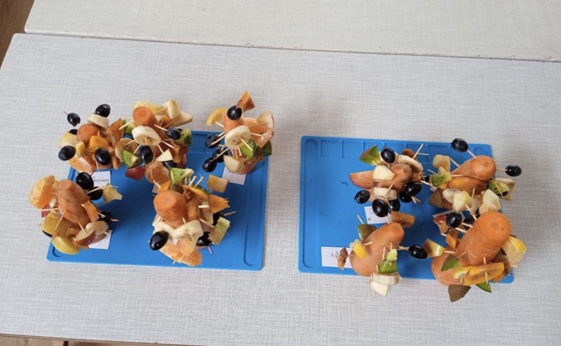 Дети выбирают фрукты и с помощью шпажек создают свои фруктовые букеты.
