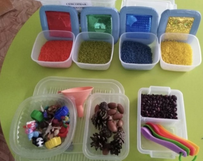 Оборудование: Пластиковые контейнеры, наполненные разными материалами: манка, фасоль, кинетический песок, вода. Набор мелких игрушек и инструментов (совочки, ситечки, пинцеты).