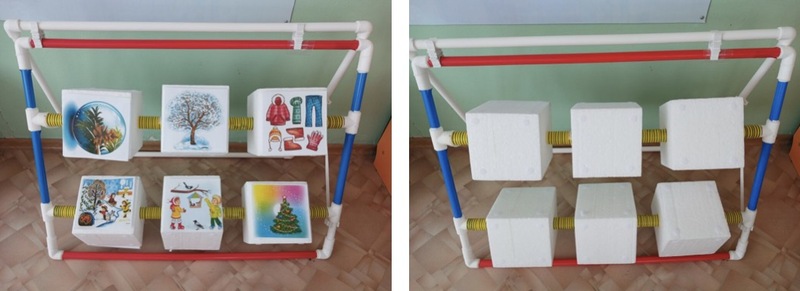 Ширма, на которой закреплены по 3 кубика в два ряда( всего 6 кубиков). Кубики выполнены из пенопласта, достаточно крупных размеров. На каждой грани расположены липучки, на которые можно размещать различные картинки. Кубики легко вращаются. |