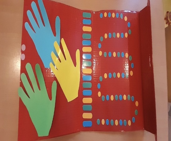 нужно положить на цветную ладошку такого же цвета, где находится пальчик первой руки