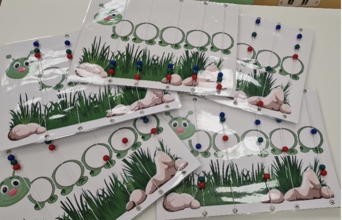 Оборудование: распечатанные и ламинированные иллюстрации с изображением гусеницы с одной стороны и паровозика с другой, черные бусины, обозначающие место звука в слове (начало, середина, конец), цветные бусины (красная, синяя и зеленая) обозначающие звуки (гласный, согласный твердый и согласный мягкий), люверсы, леска для нанизывания нужного элемента.
