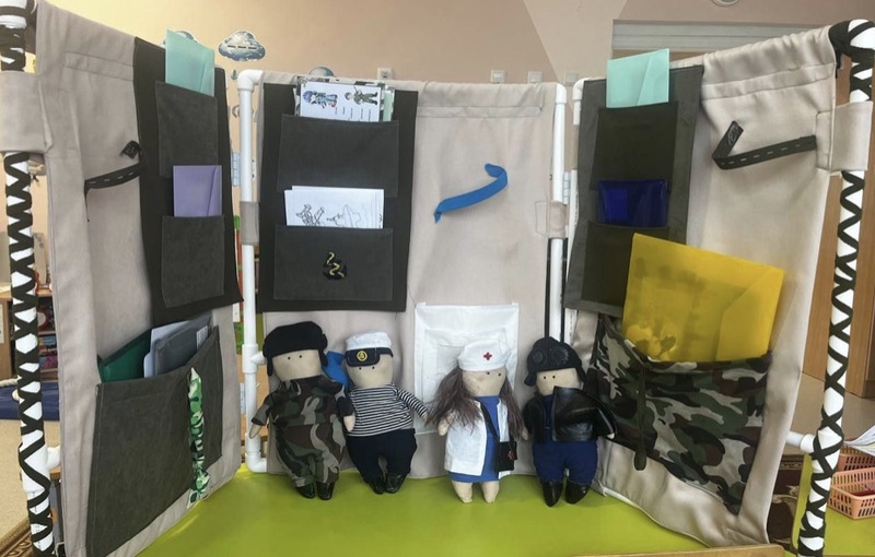 В средней части ширмы расположены 2 дидактические куклы «Матрос и Медсестра» и карман для игр. На левой части ширмы расположена дидактическая кукла «Пехотинец» и карман для игр . В них можно положить атрибуты для игр.