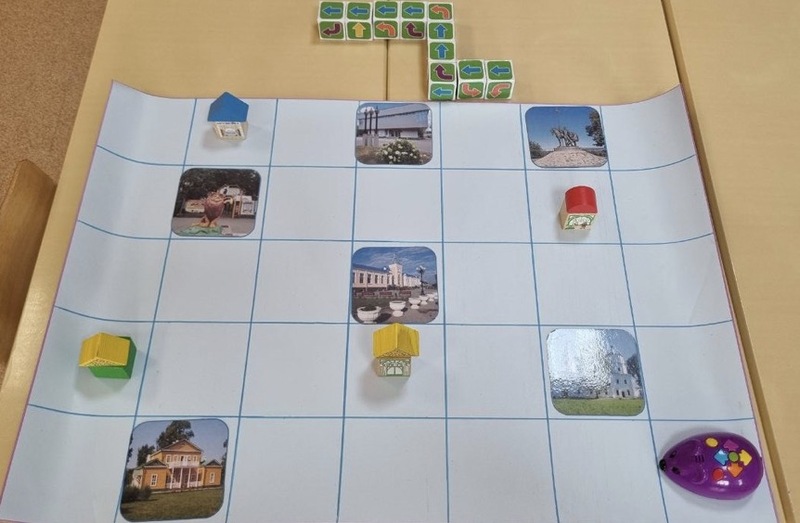 - По одному краю поля расставлены карточки с достопримечательностями, мышь стоит на противоположной стороне, играющим дается схема пути, нужно определить к какой карточке придет Робомышь, если будет передвигаться по данной схеме и назвать эту достопримечательность, запрограммировать мышь и проверить.