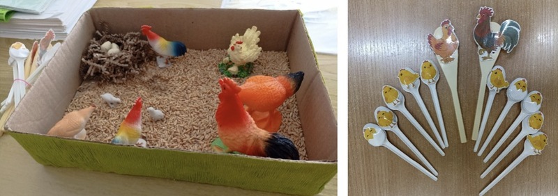 Центр природы (природный уголок): игрушки, изображающие петуха, курицу и цыплят; крупы в баночках – фасоль и горох; игрушечный птичий двор, музыкальное сопровождение – записи с голосами домашних птиц.