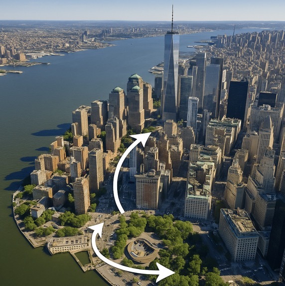 - Авторская иллюстрация Рис. 1 «Streets of New York» (создано на основе изображения Google Earth, 3D-вид Манхэттена, 02.11.2025).