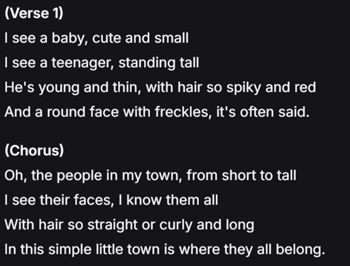 Ещё одним из примеров применения нейросетевых технологий является создание учебных материалов, направленных не только на усвоение лексики, но и на развитие умений аудирования. В своей практике преподавания для реализации этой цели была использована лексика по теме «Описание внешности» и сгенерированная нейросетевым чат-ботом DeepSeek песня. Первым этапом работы стало составление промпта в нейросеть: «Напиши песню на английском языке для учащихся средних классов, используя следующие лексические единицы из темы «Описание внешности». Песня должна иметь простую структуру (куплеты, припев), быть ритмичной и легко восприниматься на слух». В ответ на данный промпт нейросеть DeepSeek сгенерировала песню под названием “The People In My Town”: