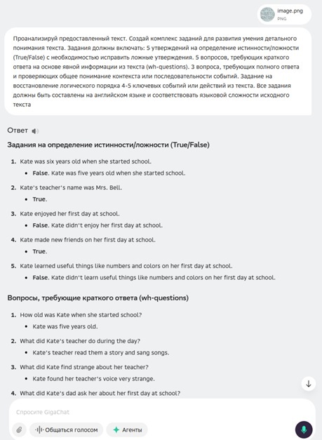 Если учителем была поставлена задача совершенствования умения полного понимания прочитанного текста, то с помощью запроса, чат-боты могут предложить разнообразные задания. Преподаватель может использовать следующий детализированный промпт, который не требует самостоятельного определения типов заданий: «Проанализируй предоставленный текст. Создай комплекс заданий для развития умения детального понимания текста. Задания должны включать: 5 утверждений на определение истинности/ложности (True/False) с необходимостью исправить ложные утверждения. 5 вопросов, требующих краткого ответа на основе явной информации из текста (wh-questions). 3 вопроса, требующих полного ответа и проверяющих общее понимание контекста или последовательности событий. Задание на восстановление логического порядка 4-5 ключевых событий или действий из текста. Все задания должны быть составлены на английском языке и соответствовать языковой сложности исходного текста». Данный промпт позволяет учителю, не обладающему заранее подготовленным планом работы с текстом, получить структурированный и методически разнообразный комплект упражнений, направленных на всестороннюю проверку понимания.
