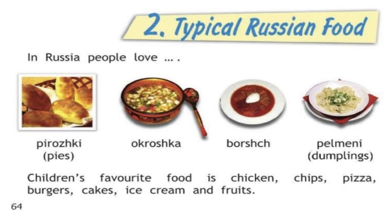 Учитель: Good job! Now we’re going to know some interesting information about traditional food in Russia. Open your books on page 64. Look at the pictures. What do you see here?