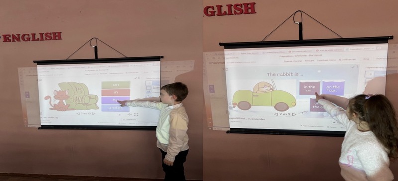 На фотографияя представлен фрагмент интерактивной игры «Волшебный мир английских предлогов места».