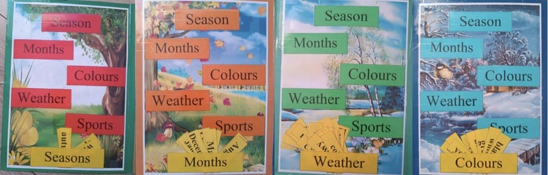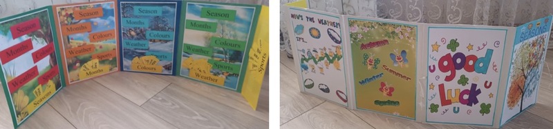Основная работа заключается в том, что учащимся предоставляется раскладушка с картинками, изображающими четыре сезона. Из кармашка с заданием «Seasons» ребятам необходимо достать карточку с названием нужного времени года и положить в нужный пустой кармашек. Аналогичная работа проводится с кармашком «Month», когда дети распределяют карточки, соответствующие месяцам каждого сезона, с кармашком «Colours»- подбор цветов, определяющих цвет сезона, с кармашком «Weather»- соответствующая каждому времени года погода и кармашком « Sports»- распределение карточек с разнообразными видами спорта.