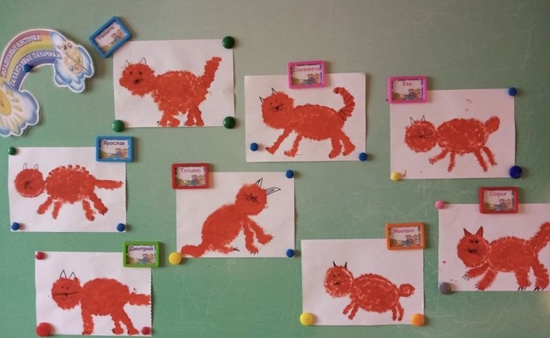 Педагог доп. образования: я предлагаю вам нарисовать рыжих котят с помощью трафаретов (круг – голова, овал – туловище) и жесткой кисти, которая не любит воду и рисует тычком, а ушки, глаза, нос и усы дорисуем фломастером.