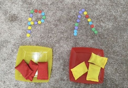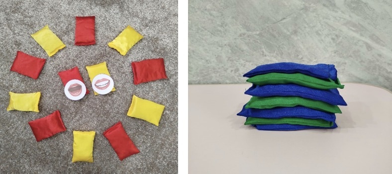 3. Для дифференциации звуков. Берем 2 цвета мешочков, закрепляем за ними символы нарушенных звуков, или букву, например: Р и Л. Необходимо распределить мешочки, опираясь на фонематический слух. Можно усложнить задание: красные мешочки собираешь на желтую тарелку, а желтые мешочки – на красную тарелку. Либо левой рукой берешь только красный. Правой рукой берешь зеленый. Либо можно использовать и кинестетические ощущения: легкие мешочки – это звук Р, тяжелые мешочки – Л. Либо шумные мешочки – это Р, тихие – Л.