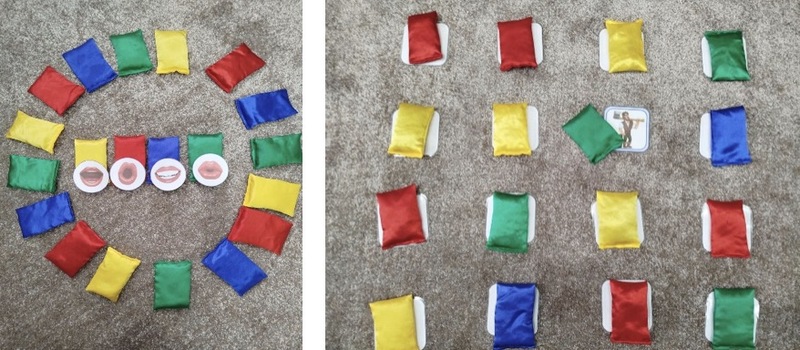 1. Для закрепления правильно произносимых звуков на том этапе, когда ребенку уже не требуется зеркало. Как играть: игра проводится на ковре. За каждым цветом мешочка закрепляется гласный звук на символах. Например: синий – а, красный – о, зеленый - у, желтый – ы. Далее ребенок произносит автоматизируемый звук и берет нужный мешочек, собирает в корзинку, или можно усложнить, собирает по заданной схеме: у. о, у. о. Также можно разложить картинки на автоматизацию звука под мешочки на ковре. По заданию логопеда ребенок ищет заданную картинку от исходного мешочка: 2 картинки вверх, одна вправо, одна влево. Ребенок переворачивает картинки и называет слово. Решаемые коррекционные задачи: автоматизация звука, пространственная ориентировка, сенсорные ощущения.