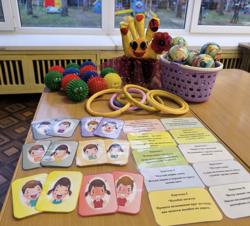- Набор цветных карточек с названием и описанием пальчиковой гимнастики;